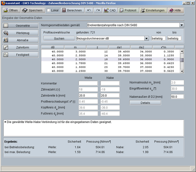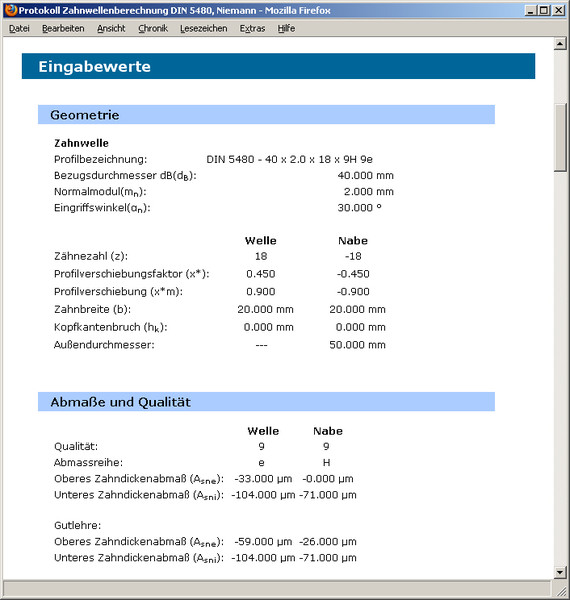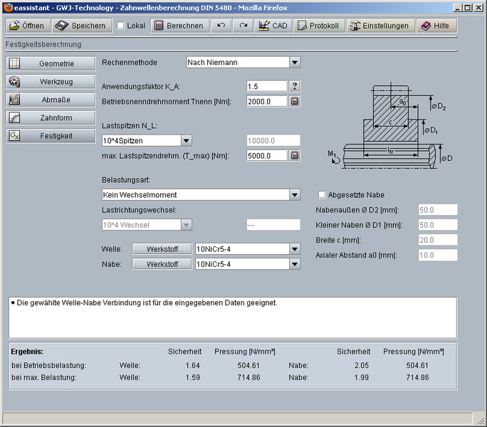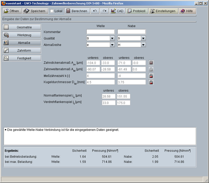 Obliczenia wytrzymałościowe przeprowadzane są według Niemanna „Maschinenelemente“ Band 1, Ausgabe 2001. Dopuszczalne naciski określane są z podanych wartości materiałowych, dzięki czemu można również korzystać